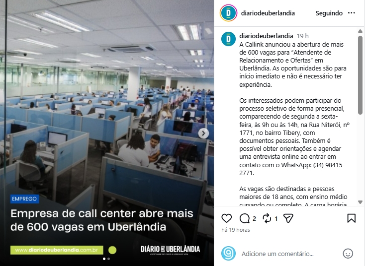 A Callink anunciou a abertura de mais de 600 vagas para “Atendente de Relacionamento e Ofertas” em Uberlândia.