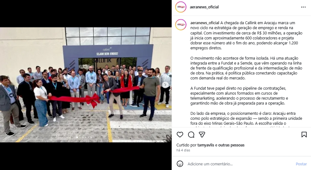 A chegada da Callink em Aracaju marca um novo ciclo na estratégia de geração de emprego e renda na capital