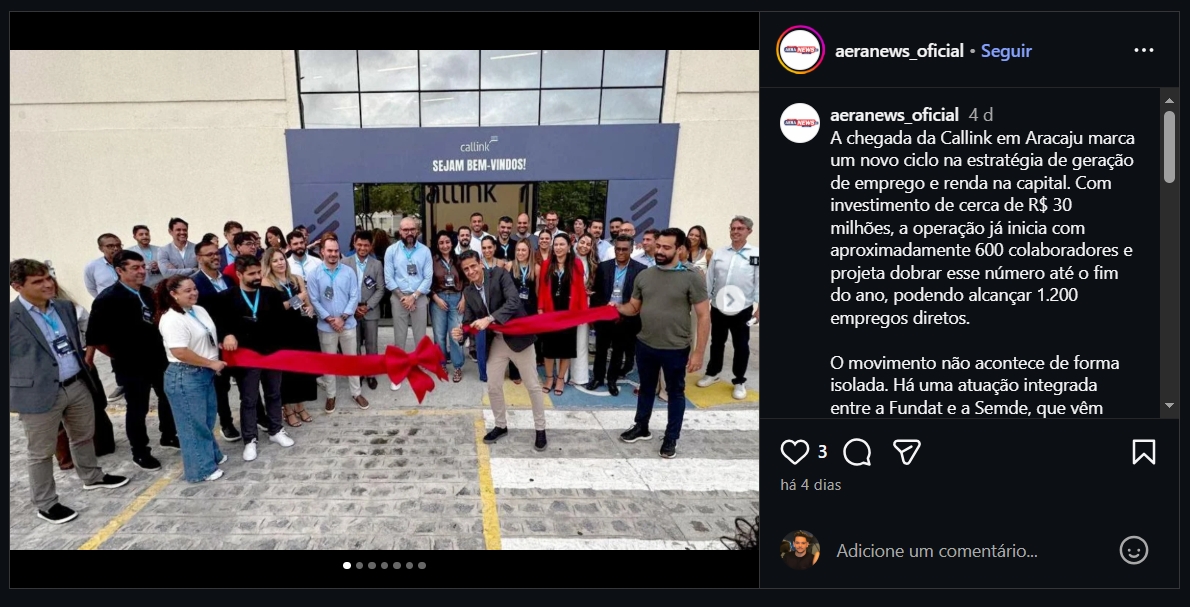 A chegada da Callink em Aracaju marca um novo ciclo na estratégia de geração de emprego e renda na capital