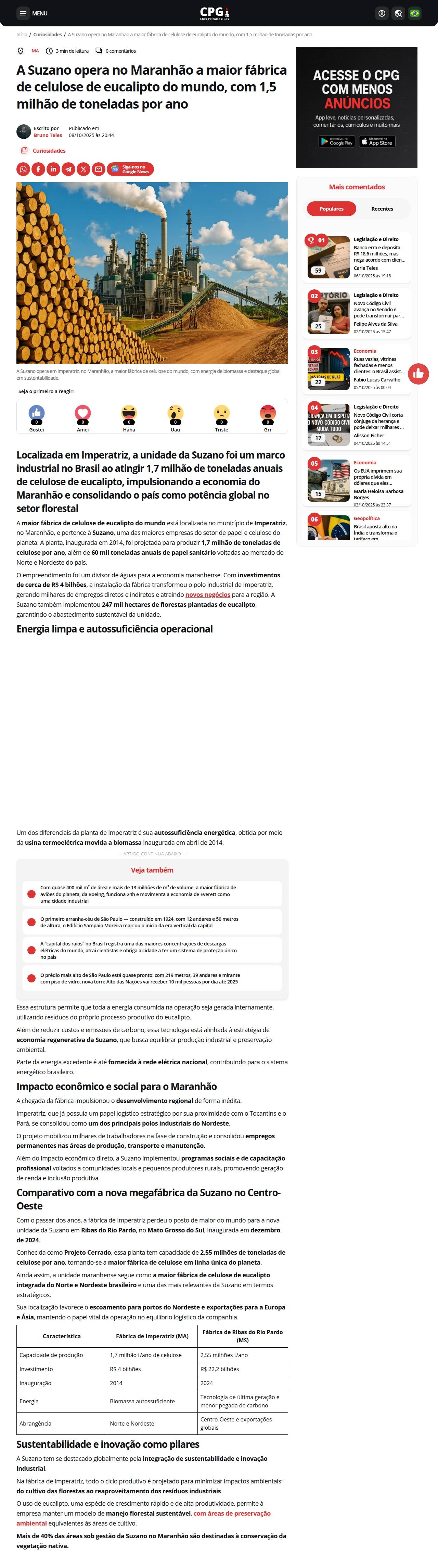 A Suzano opera no Maranhão a maior fábrica de celulose de eucalipto do mundo, com 1,5 milhão de toneladas por ano