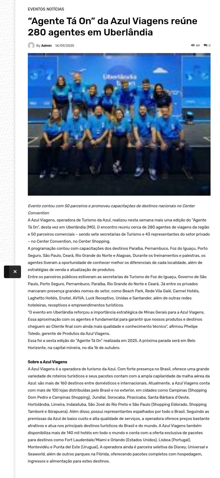 "Agente Tá On" da Azul Viagens reúne 280 agentes em Uberlândia VOENEWS - Notícias do Turismo