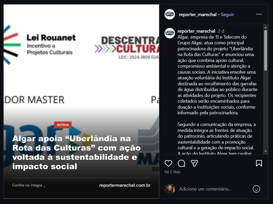 Algar apoia "Uberlândia Rota das Culturas" com ação voltada à sustentabilidade e impacto social
