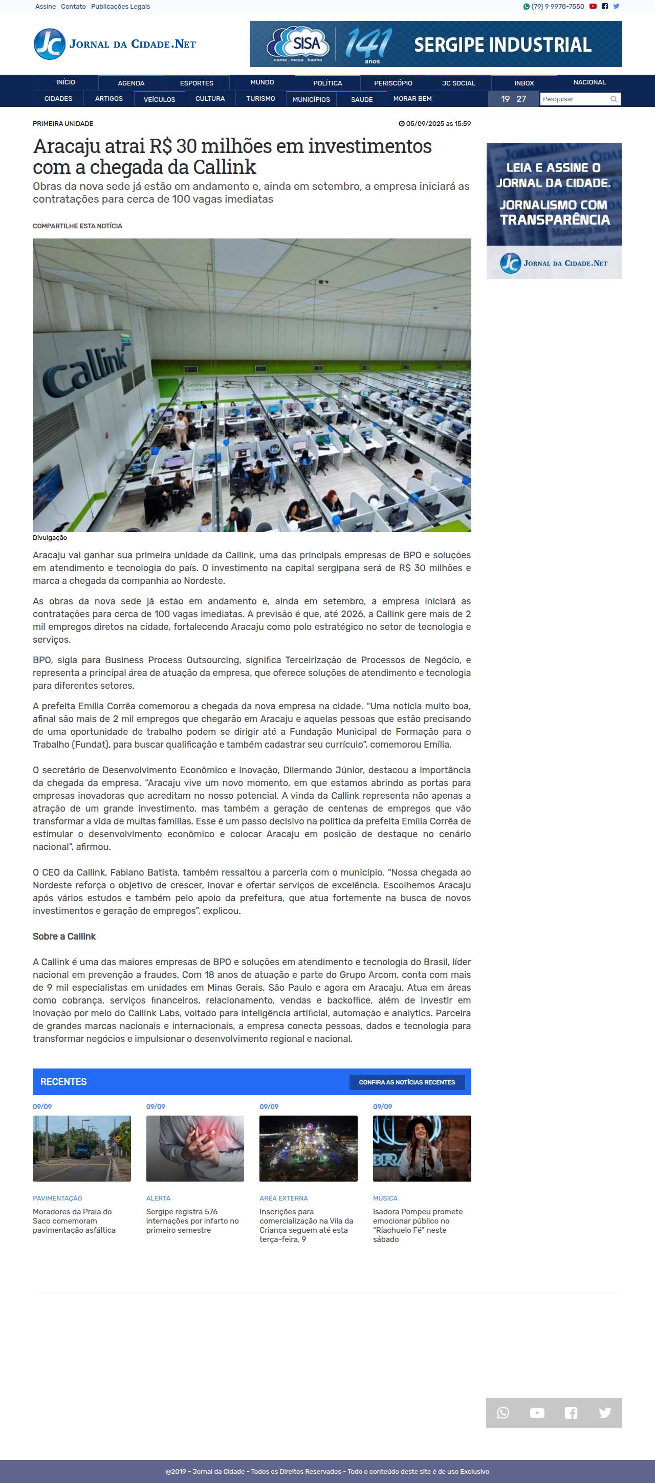Aracaju atrai R$ 30 milhões em investimentos com a chegada da Callink