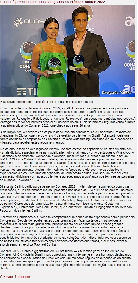 Callink é premiada em duas categorias no Prêmio Conarec 2022