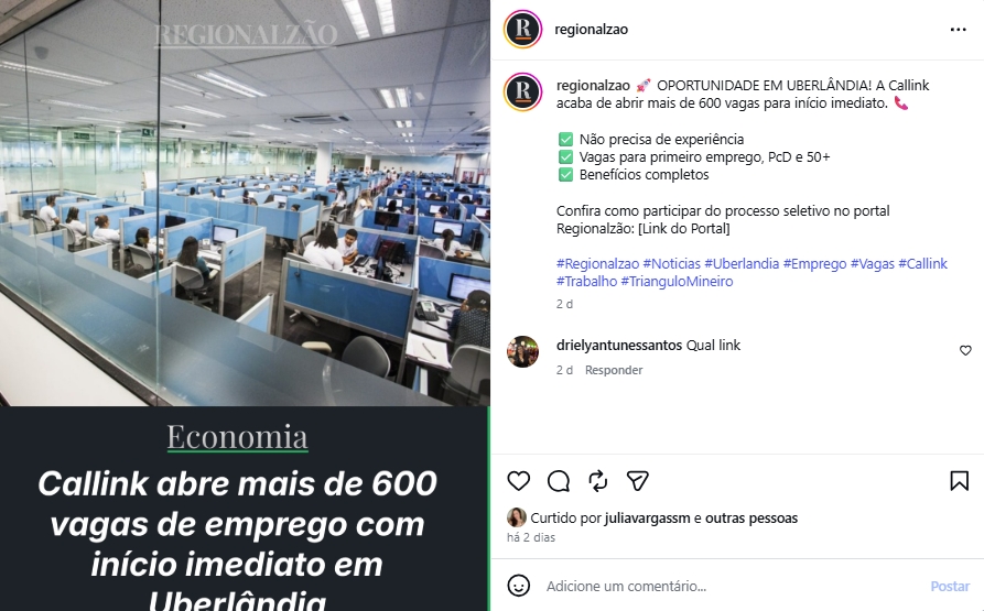 Callink tem 600 novas vagas para atendimento em Uberlāndia