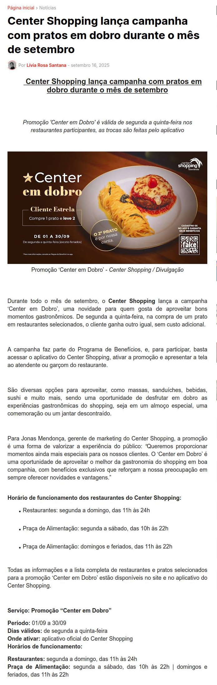 Center Shopping lanįa campanha com pratos em dobro durante o męs de setembro