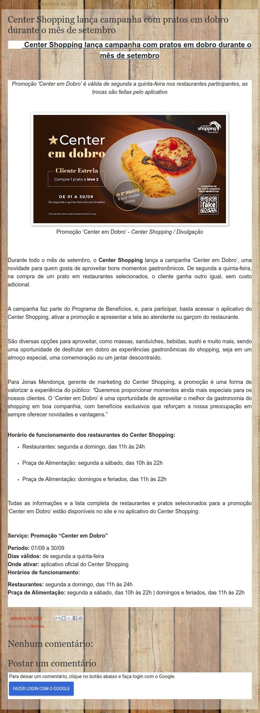 Center Shopping lanįa campanha com pratos em dobro durante o męs de setembro