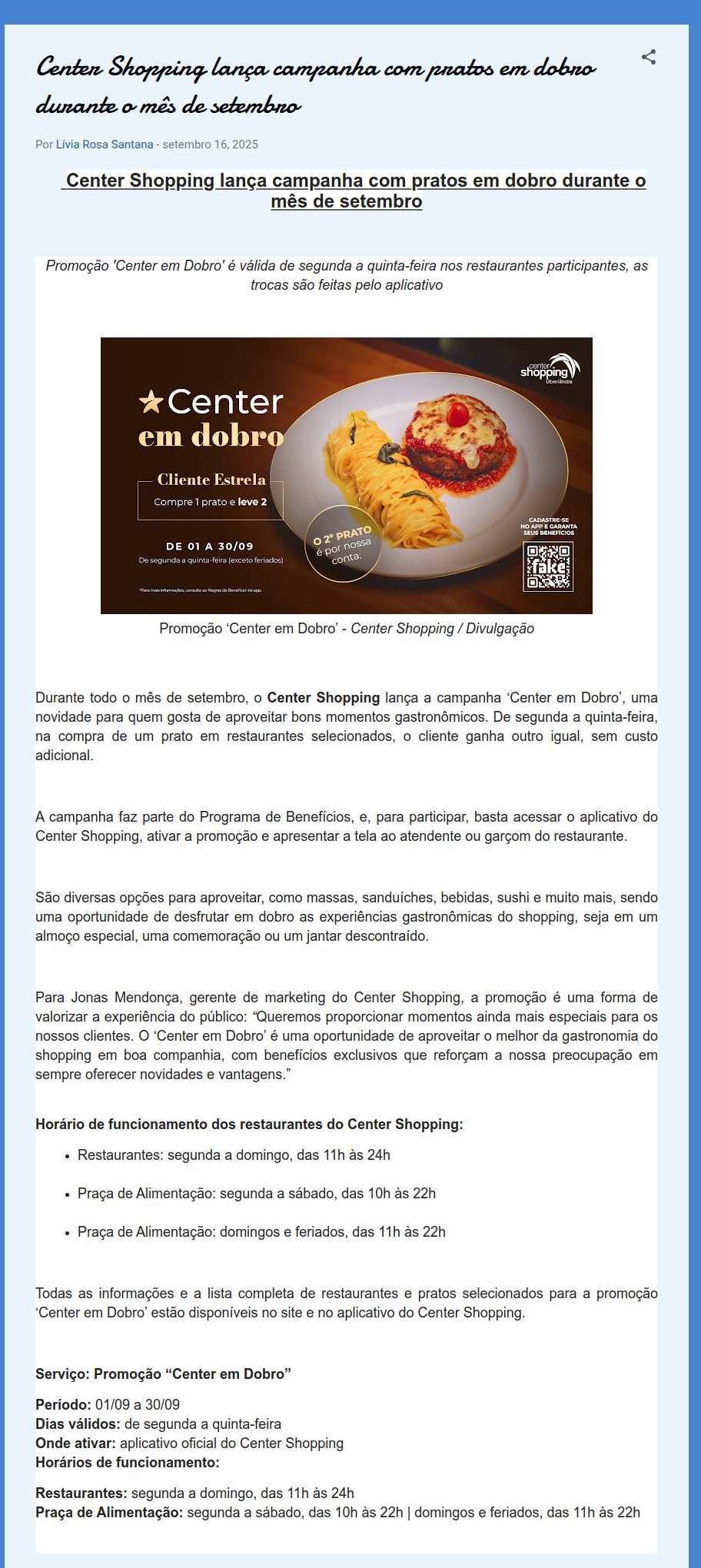 Center Shopping lança campanha com pratos em dobro durante o mês de setembro