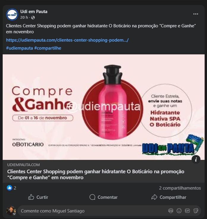 Clientes Center Shopping podem ganhar hidratante O Boticário na promoção “Compre e Ganhe” em novembro