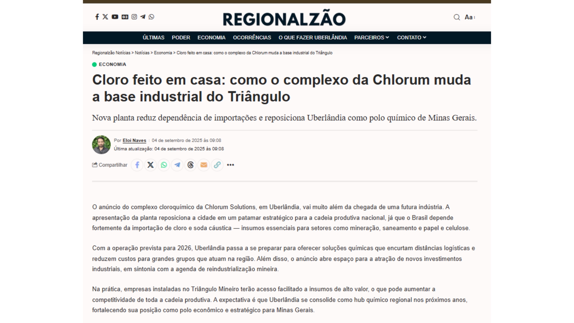 Cloro feito em casa: como o complexo da Chlorum muda a base industrial do Triāngulo