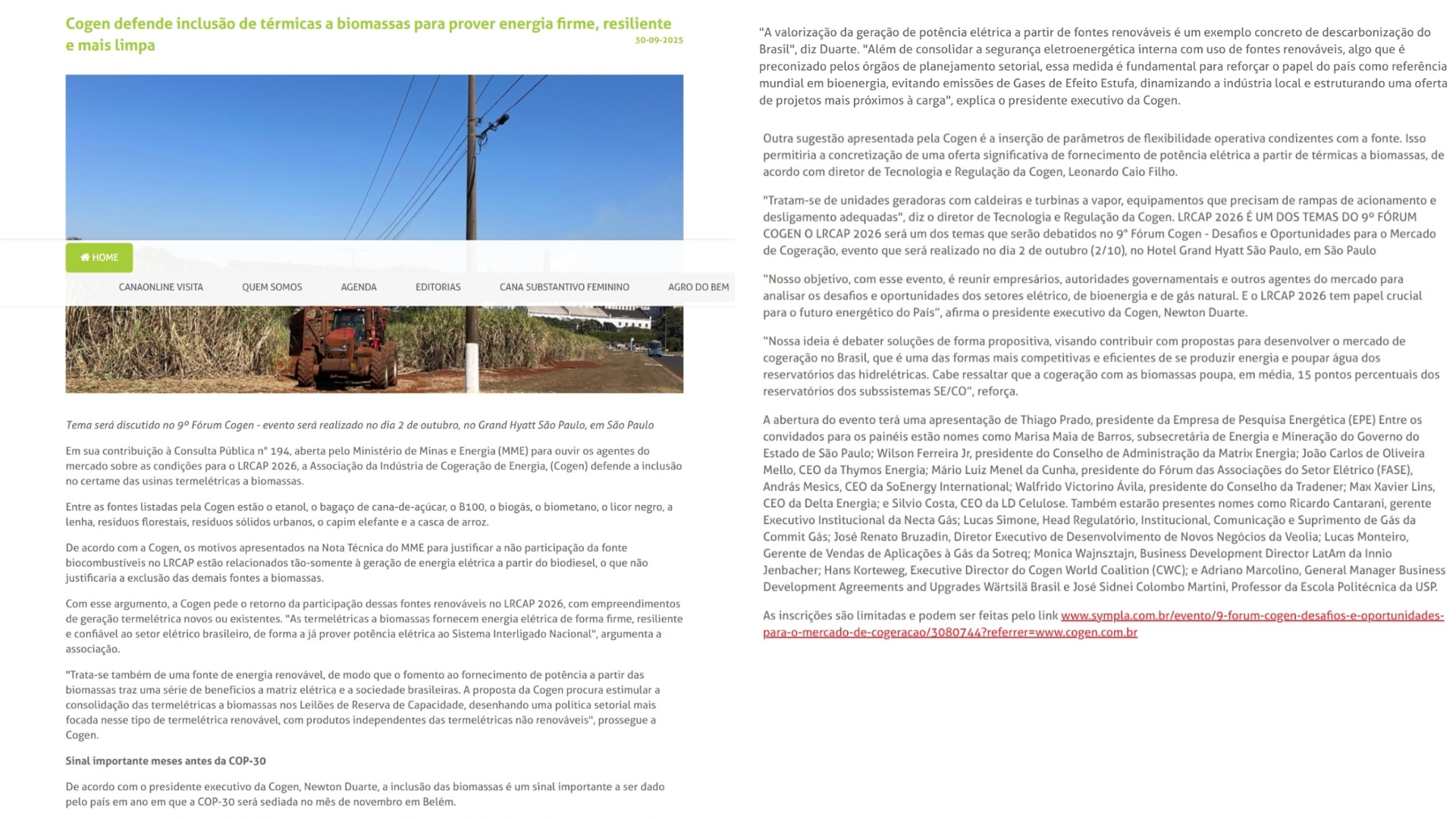 Cogen defende inclusão de térmicas a biomassas para prover energia firme, resiliente e mais limpa Cana Online