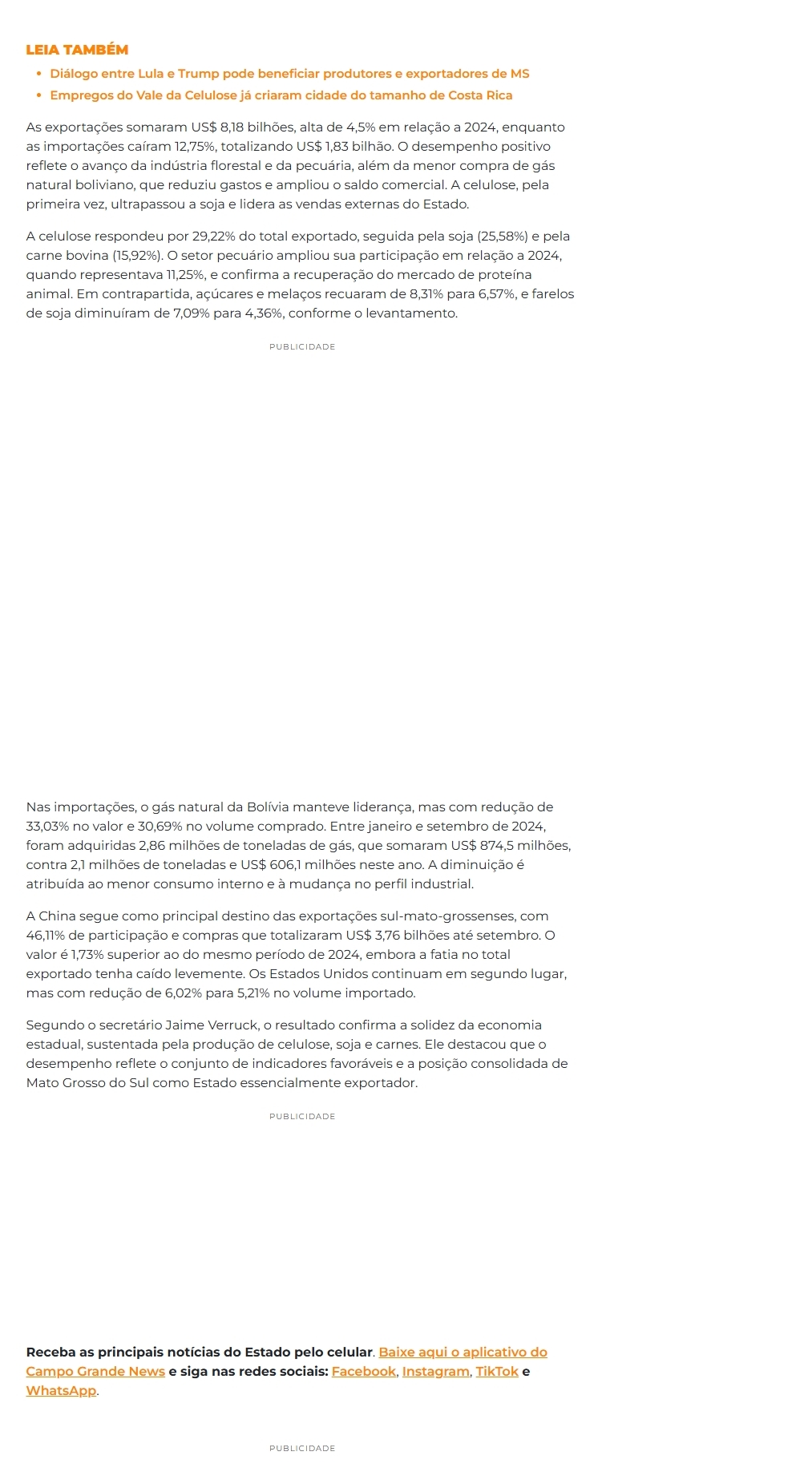 Com celulose na liderança, MS alcança superávit de US$ 6,34 bilhões... veja mais em https://www.campograndenews.com.br/economia/com-celulose-na-lidera