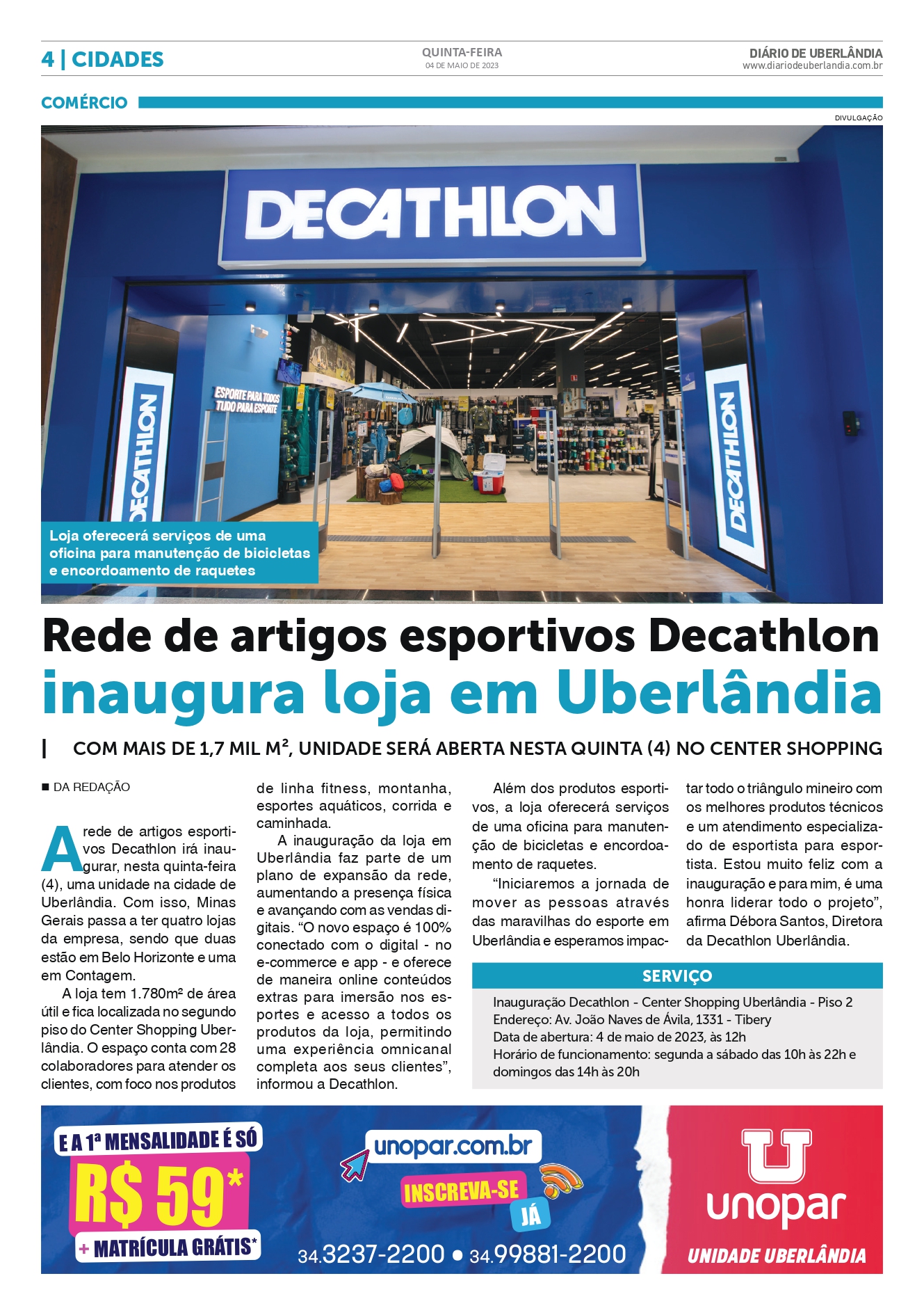 DIÁRIO DE UBERLÂNDIA - Decathlon inaugura sua quarta loja em Minas Gerais - 04.05