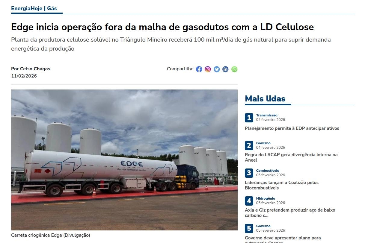 Edge inicia operação fora da malha de gasodutos com a LD Celulose