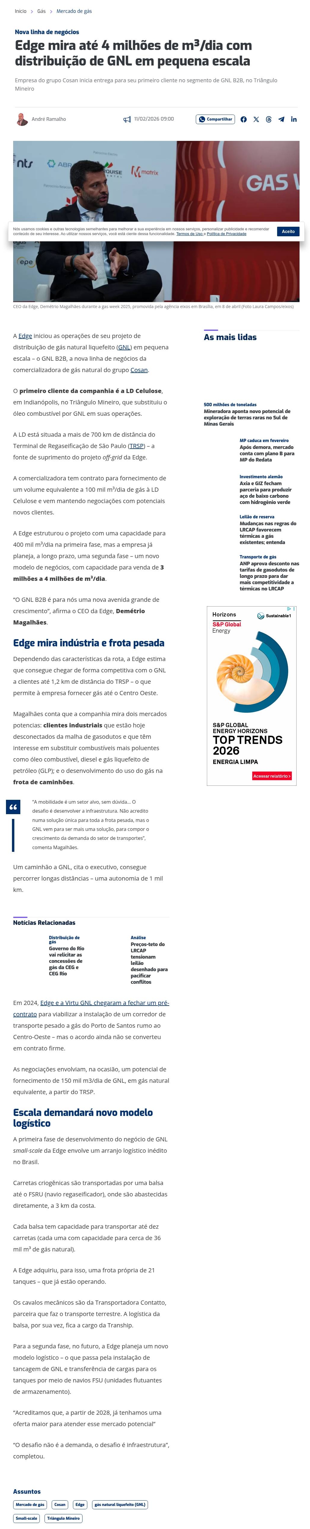 Edge mira até 4 milhões de m³/dia com distribuição de GNL em pequena escala