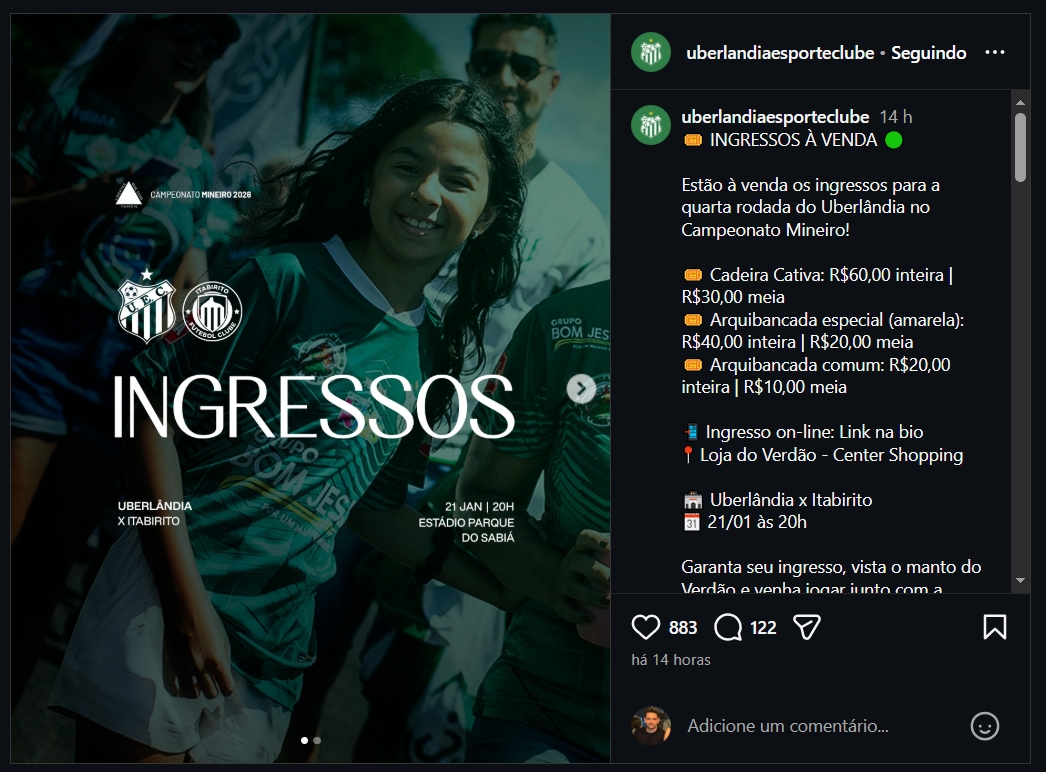 Estão à venda os ingressos para a quarta rodada do Uberlândia no Campeonato Mineiro!