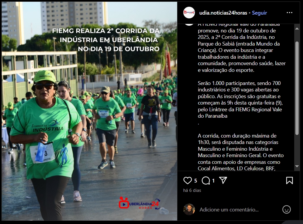 FIEMG realiza 2ª Corrida da Indústria em Uberlândia no dia 19 de Outubro