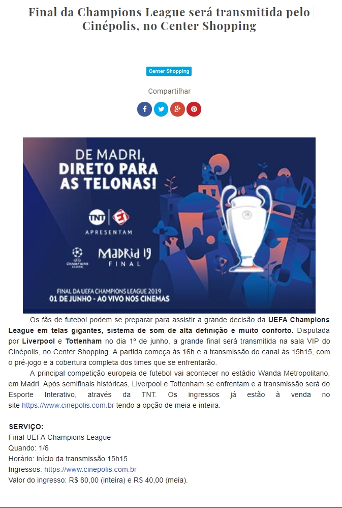Final da Champions League será transmitida pelo Cinépolis, no Center Shopping