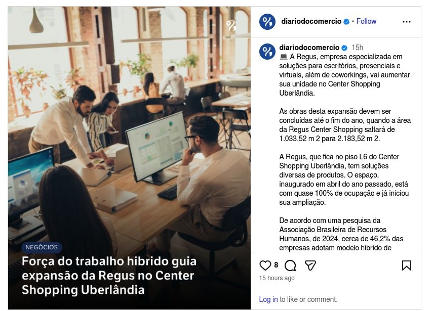 Força do trabalho híbrido guia expansão da Regus no Center Shopping Uberlândia