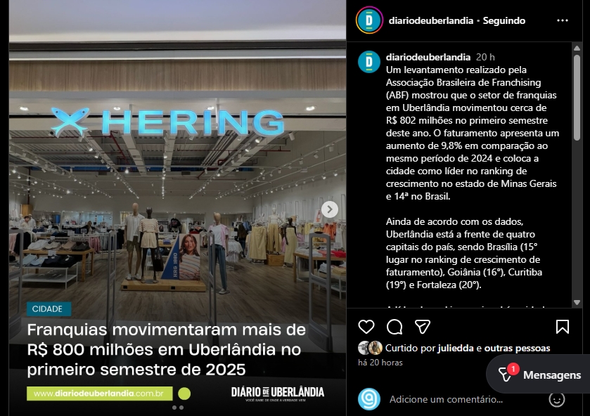 franquias em Uberlândia movimentou cerca de R$ 802 milhões no primeiro semestre deste ano - Entrevista na Hering Center Shopping Uberlândia
