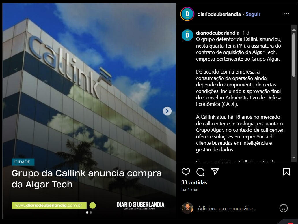 Grupo detentor da Callink anuncia a aquisição da Algar Tech