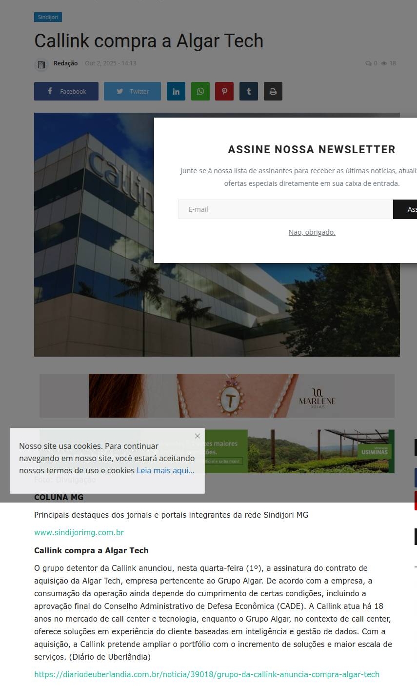 Grupo detentor da Callink anuncia a aquisição da Algar Tech