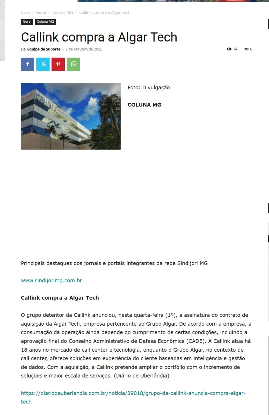 Grupo detentor da Callink anuncia a aquisição da Algar Tech