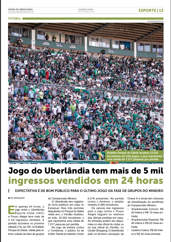 Jogo do Uberlândia tem mais de 5 mil ingressos vendidos em 24 horas