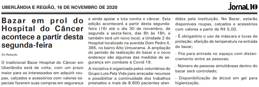 JORNAL - Bazar em prol do Hospital do Cāncer acontece a partir desta segunda-feira - 16/11