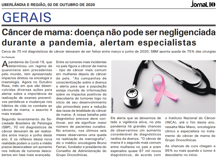 JORNAL - Câncer de mama: doença não pode ser negligenciada durante a pandemia, alertam especialistas - 01/10