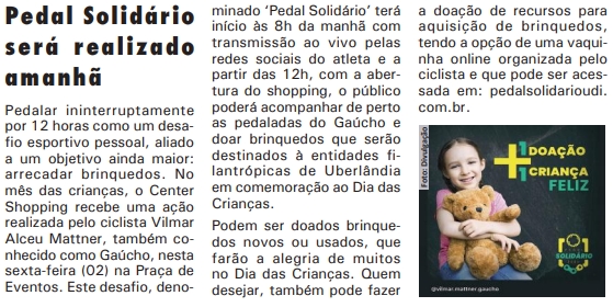 JORNAL - Center Shopping recebe Pedal Solidário no dia 2 de outubro - 01/10