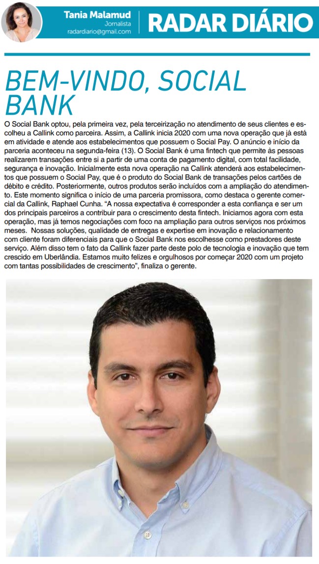 JORNAL - COLUNA RADAR DIÁRIO - Social Bank é o mais novo cliente Callink - 19/01