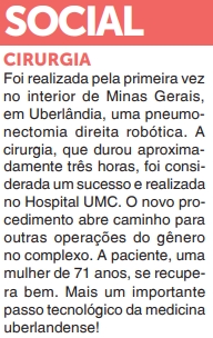 JORNAL - Coluna Social - UMC realiza primeira cirurgia robótica torácica - 22/09