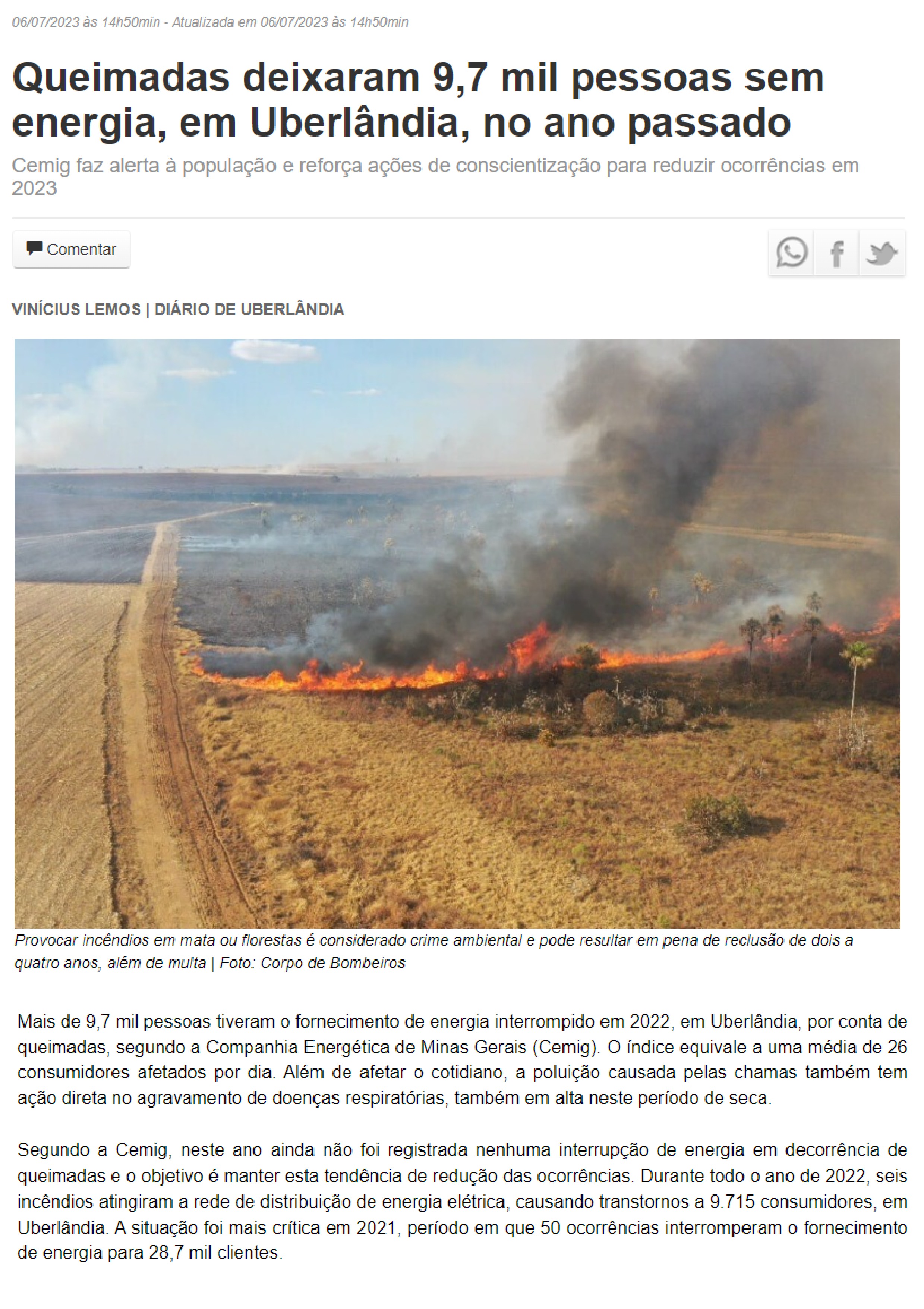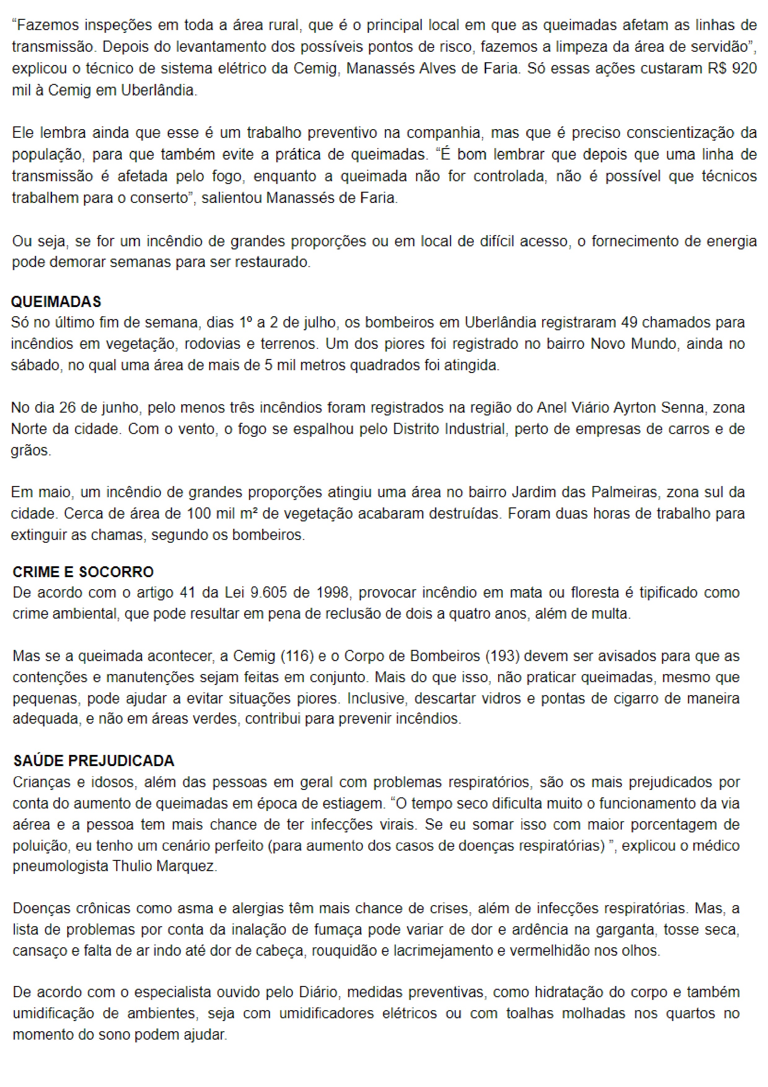 JORNAL DIÁRIO DE UBERLÂNDIA - Queimadas deixaram mais 9,7 mil pessoas sem energia no ano passado - 05.07 Entrevista Dr. Thulio