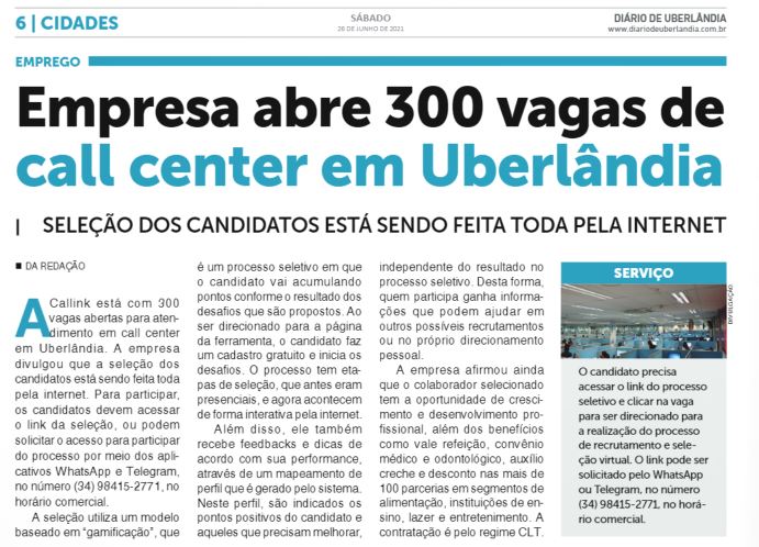 JORNAL - Empresa abre 300 vagas de call center em Uberlândia - 27.06