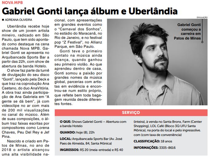 JORNAL - Gabriel Gonti lança álbum em Uberlândia PONTO DE VENDAS (08/11)