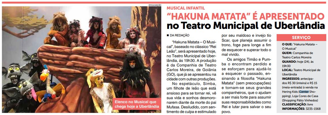 JORNAL - "HAKUNA MATATA" É APRESENTADO no Teatro Municipal de Uberlândia - PONTO DE VENDAS (24/09)