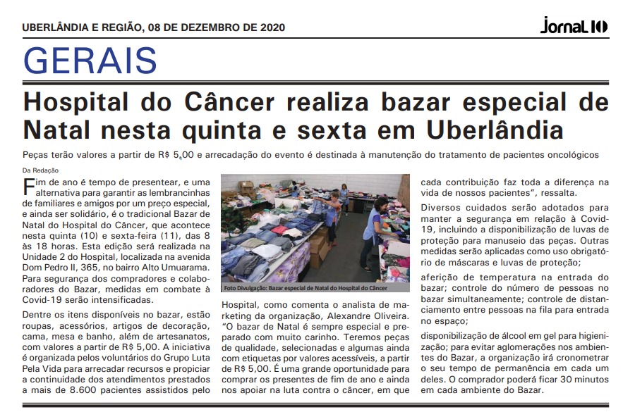 JORNAL - Hospital do Cāncer realiza bazar especial de Natal nos dias 10 e 11 de dezembro - 08/12