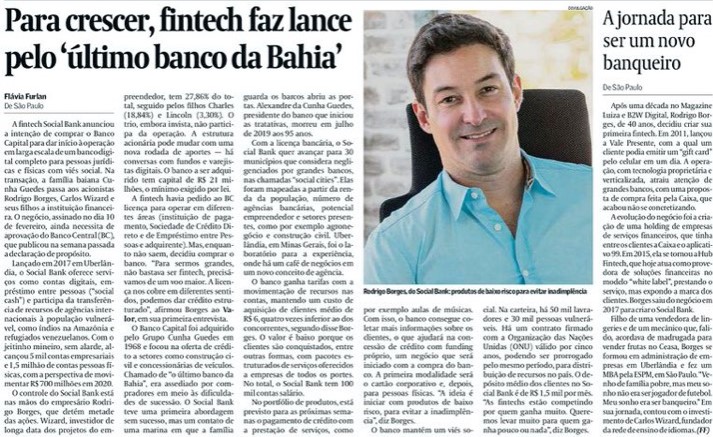 JORNAL - Para crescer, fintech faz lance pelo 'último banco da Bahia' - 01/09