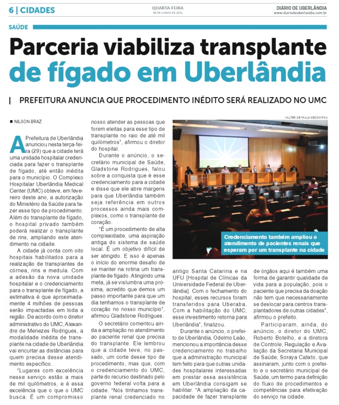 JORNAL - Parceria viabiliza transplante de fígado em Uberlândia - 30.06