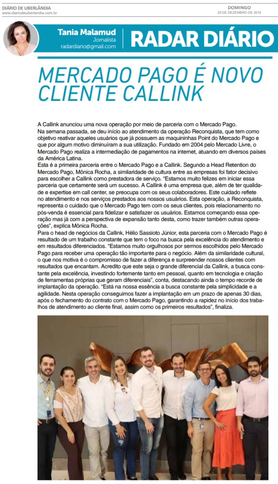 JORNAL - RADAR DIÁRIO - MERCADO PAGO É NOVO CLIENTE CALLINK - 29/12