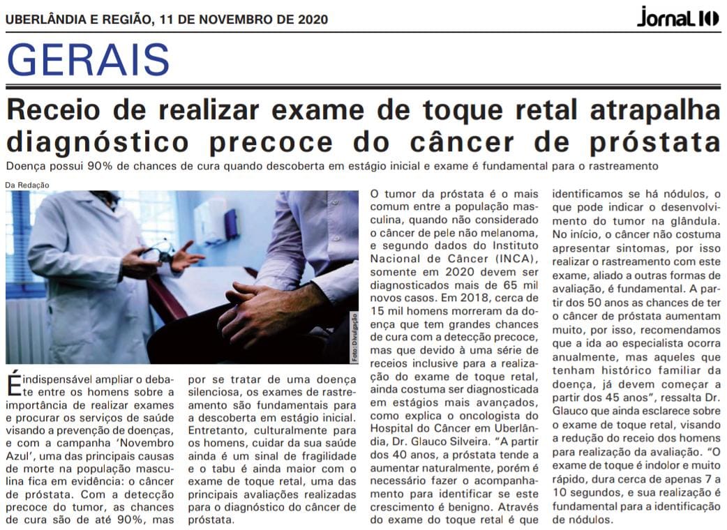 JORNAL - Receio de realizar exame de toque retal atrapalha diagnóstico precoce do câncer de próstata - 11/11