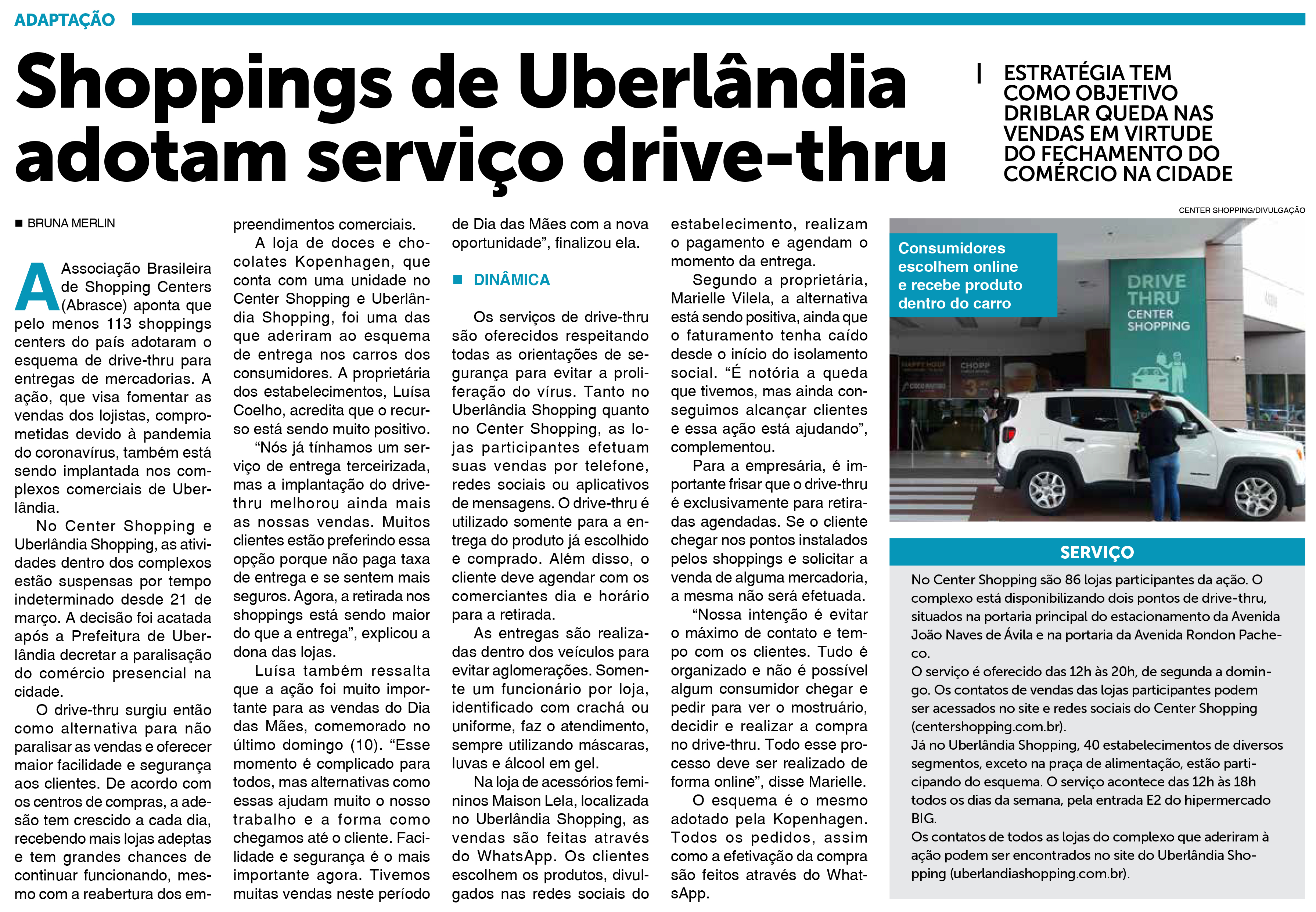 JORNAL - SHOPPINGS DE UBERLÂNDIA ADOTAM SERVIÇO DRIVE-THRU - 12/05