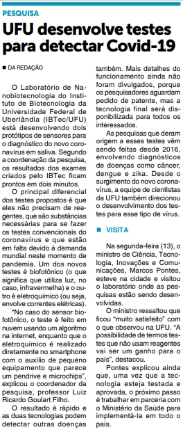 JORNAL - UFU desenvolve testes para detectar Covid-19 - 15/04