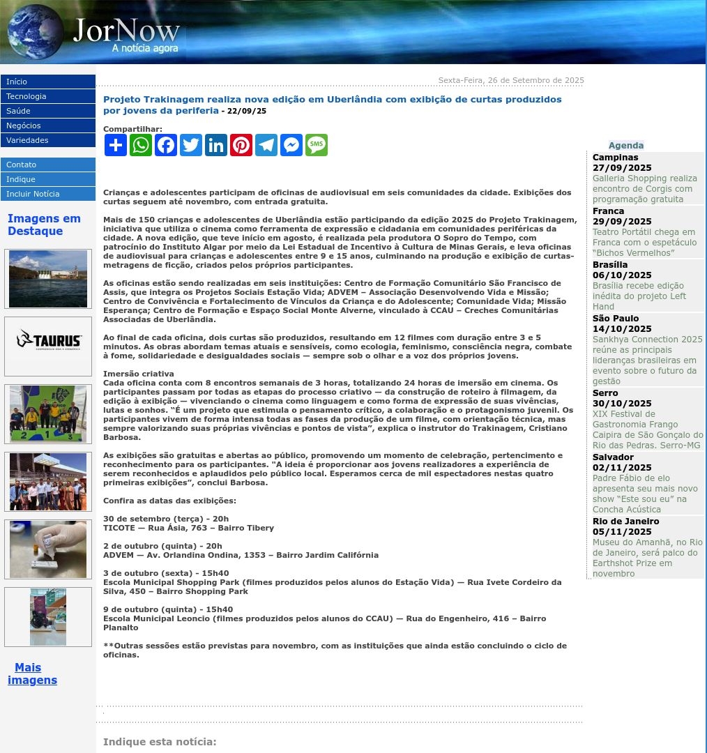JorNow - Notícia: Projeto Trakinagem realiza nova edição em Uberlândia com exibição de curtas produzidos por jovens da periferia