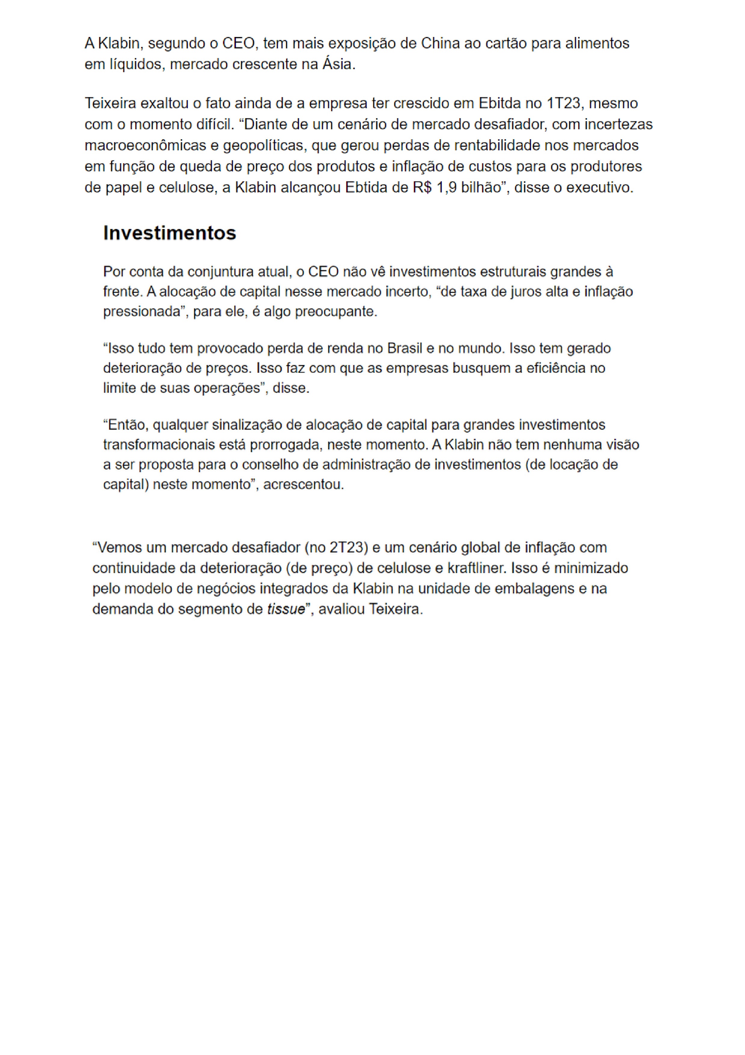 Klabin (KLBN11) vê continuidade da deterioração de preços da celulose no 2º trimestre