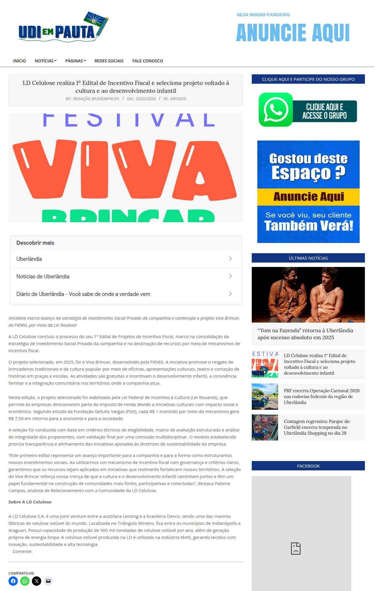 LD Celulose realiza 1º Edital de Incentivo Fiscal e seleciona projeto voltado à cultura e ao desenvolvimento infantil