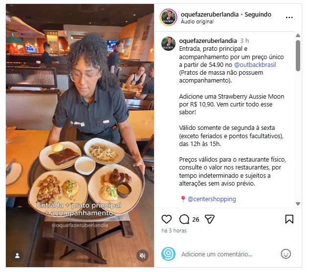 O QUE FAZER EM UBERLÂNDIA - REELS - ALMOÇO NO OUTBACK - 18/02/2026 -