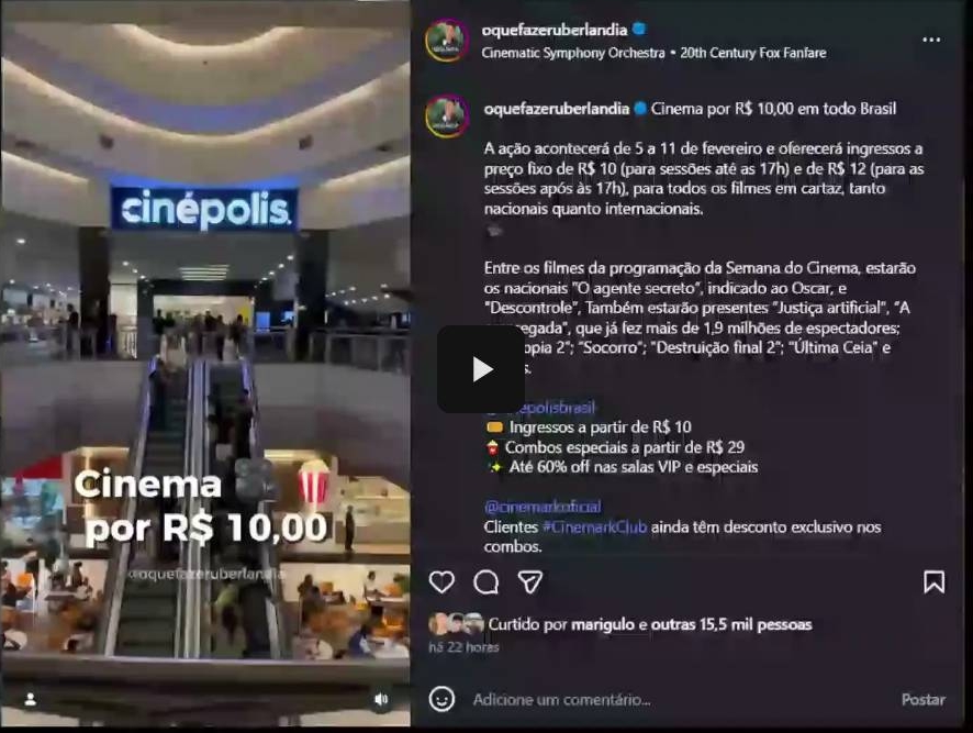 O QUE FAZER UBERLĀNDIA - REELS - CINEMA POR R$10 - 26-01