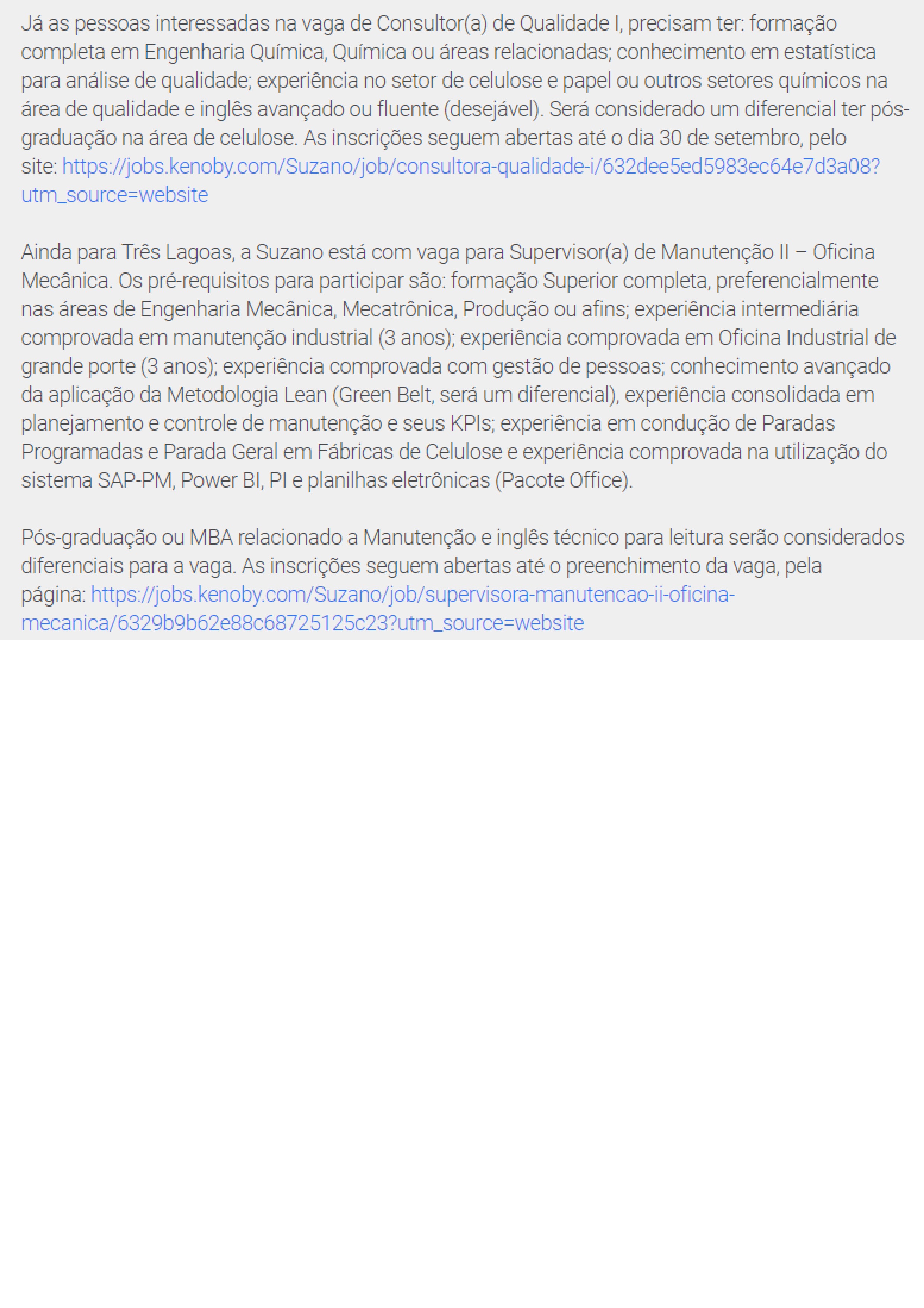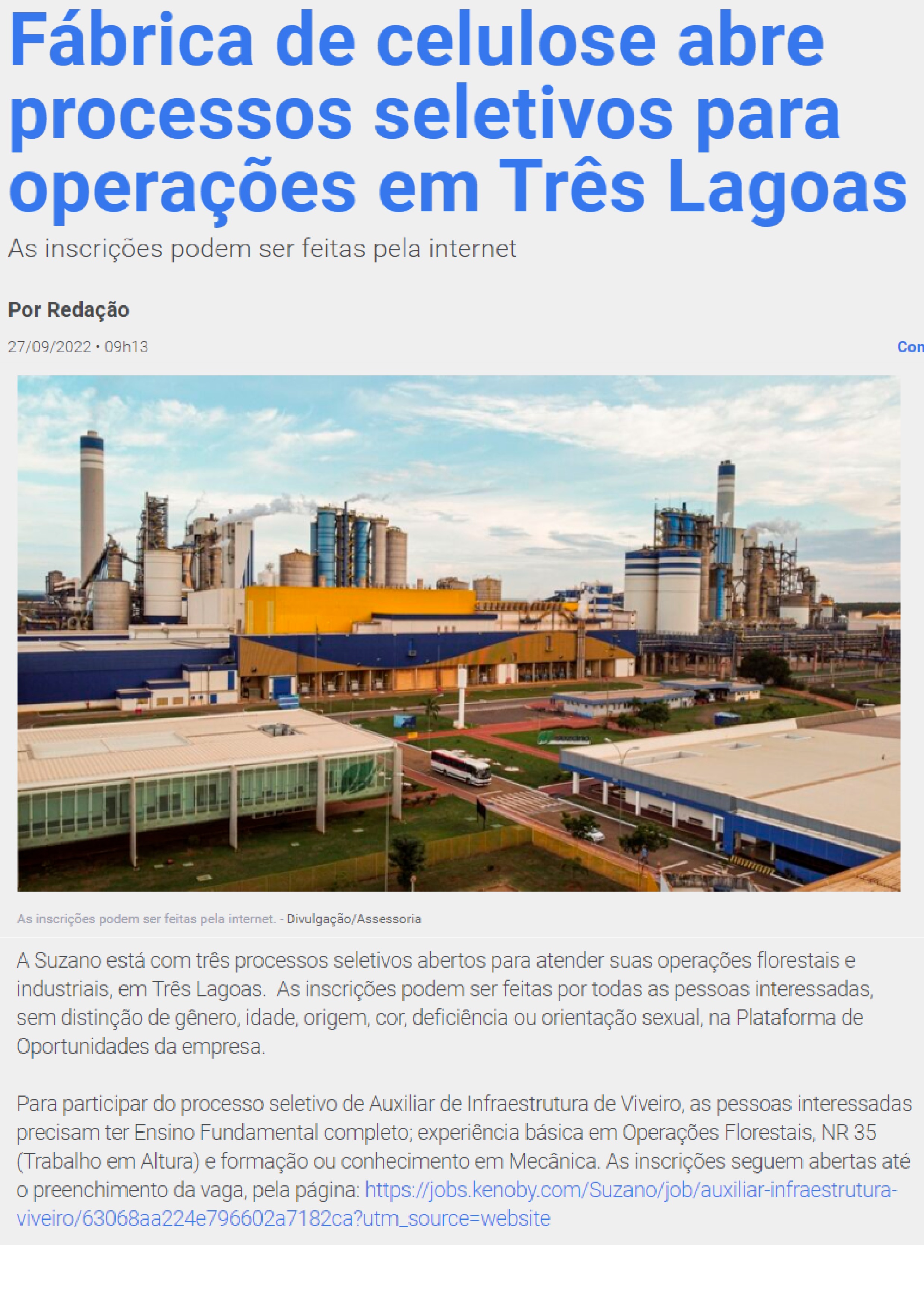 ONLINE - A A Fábrica de celulose abre processos seletivos para operações em Três Lagoas - 27.09